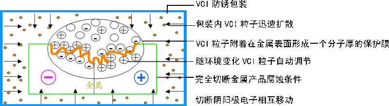 VCI是英文(Volatile Corrosion Inhibitor)的縮寫,它是一種具有揮發(fā)性的腐蝕抑制劑,簡(jiǎn)稱為氣化性防銹產(chǎn)品。當(dāng)用氣化性防銹產(chǎn)品包裝好被包裝物以后,防銹產(chǎn)品的防銹粒子氣化成氣體,吸附在金屬表面形成保護(hù)膜,切斷金屬離子與水、氧氣接觸的可能性,有效抑制了金屬腐蝕電化學(xué)反應(yīng)的發(fā)生,從而達(dá)到防銹效果。包裝后內(nèi)部的防銹粒子的氣化擴(kuò)散量自動(dòng)調(diào)節(jié),當(dāng)濕度或溫度增大時(shí),防銹粒子的擴(kuò)散量也會(huì)加大, 反之,防銹粒子的擴(kuò)散量會(huì)減小,從而來(lái)自動(dòng)調(diào)節(jié)包裝物內(nèi)部的氣體濃度,讓包裝物始終處于一種最穩(wěn)定的防銹狀態(tài)。